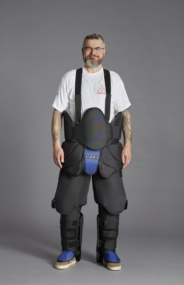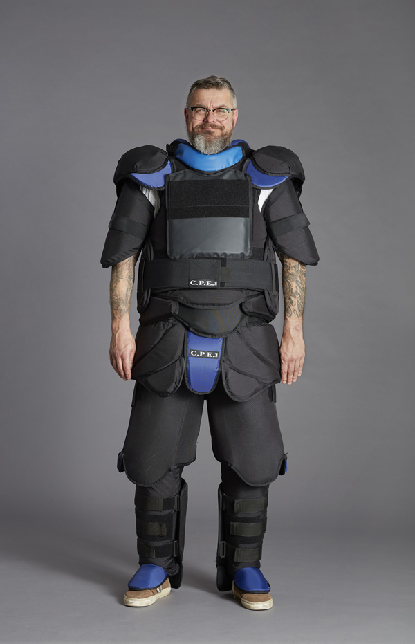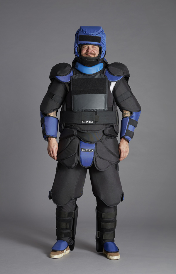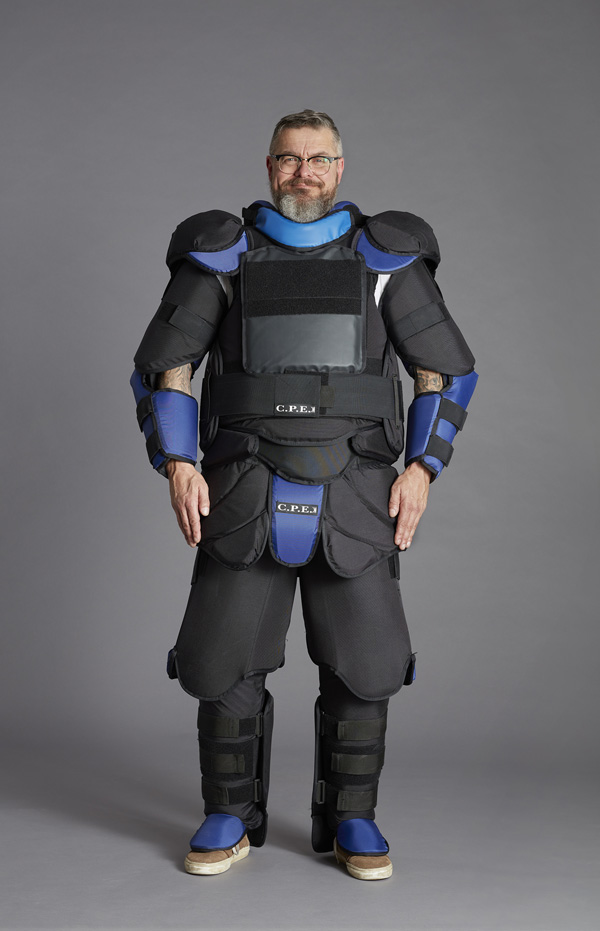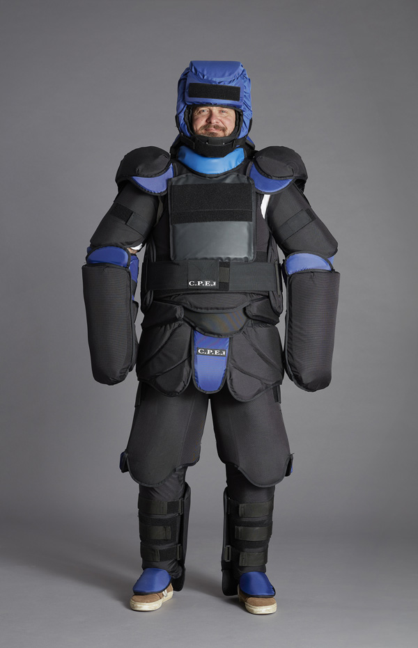 Dieser spezielle Vollkontaktschutzanzug ist für realistische Selbstverteidigung unter Vollkontaktbedingungen ausgerichtet. Selbst schwere Körpertreffer mit Holzschlägern, Escrimastücken nimmt der Anzug auf, ohne das man was davon merkt. Mit diesem Anzug können Schlag- und Tritthemmungen abgebaut werden, er ist auch geeignet spezielle Gefahrensituationen an Einlassbereichen, oder im Bereich des Personenschutzes zu trainieren und zu simulieren. Sicherheitsfirmen können ihre Mitarbeiter im Bereich des Hand to Hand fights ausbilden.