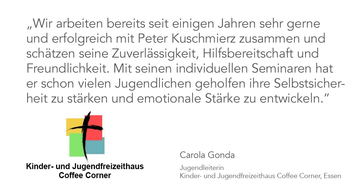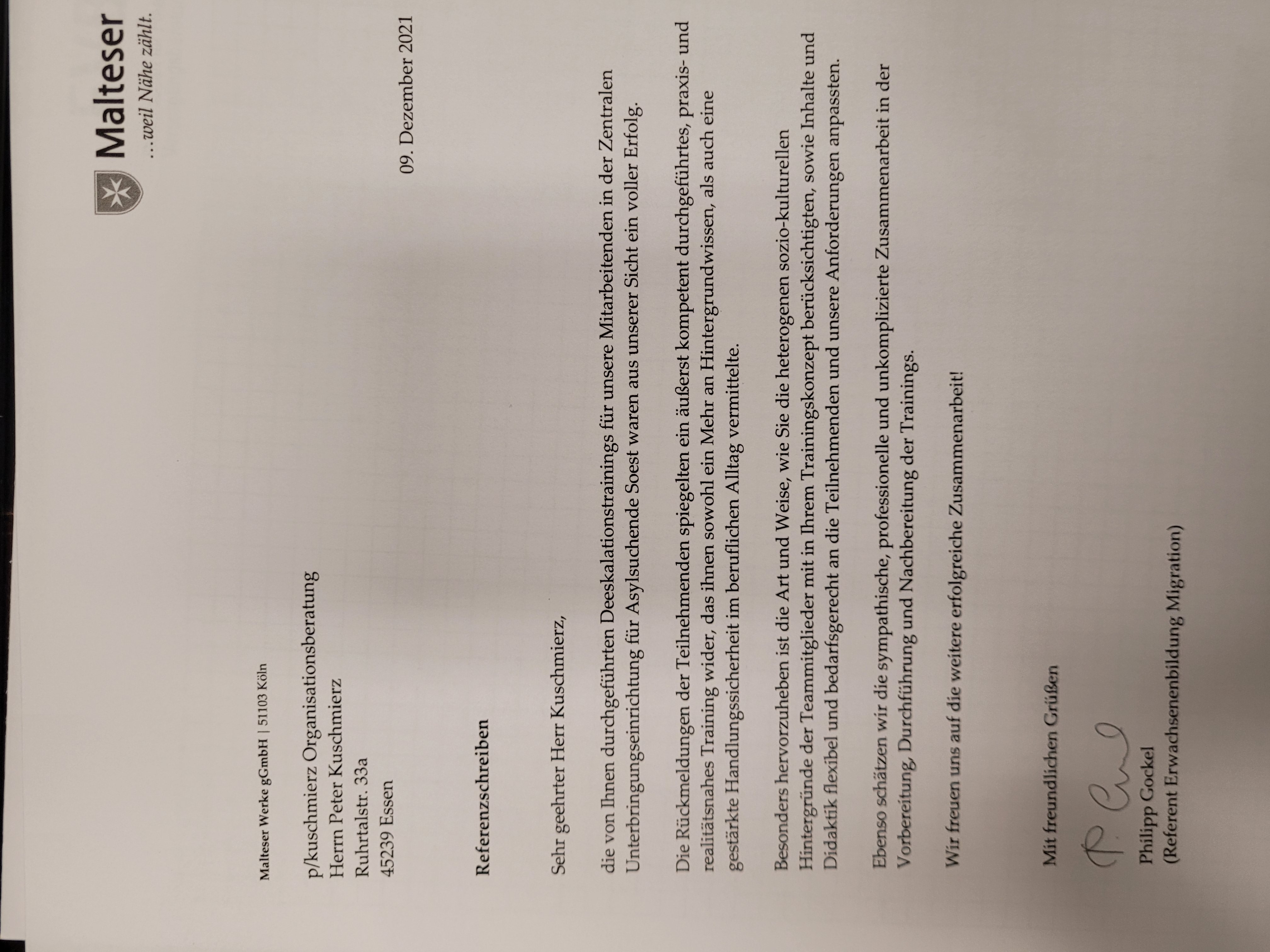 In diesem Bereich finden Sie Referenzschreiben von Auftraggebern und Kooperationspartnern, Fotos von durchgeführten Veranstaltungen und Workshops, aber auch Kurzfassungen von Vorträgen und Seminaren, die ich zu unterschiedlichen Themen im Bereich Deeskalation, Gewaltprävention, Selbstverteidigung und Stalking gehalten habe.